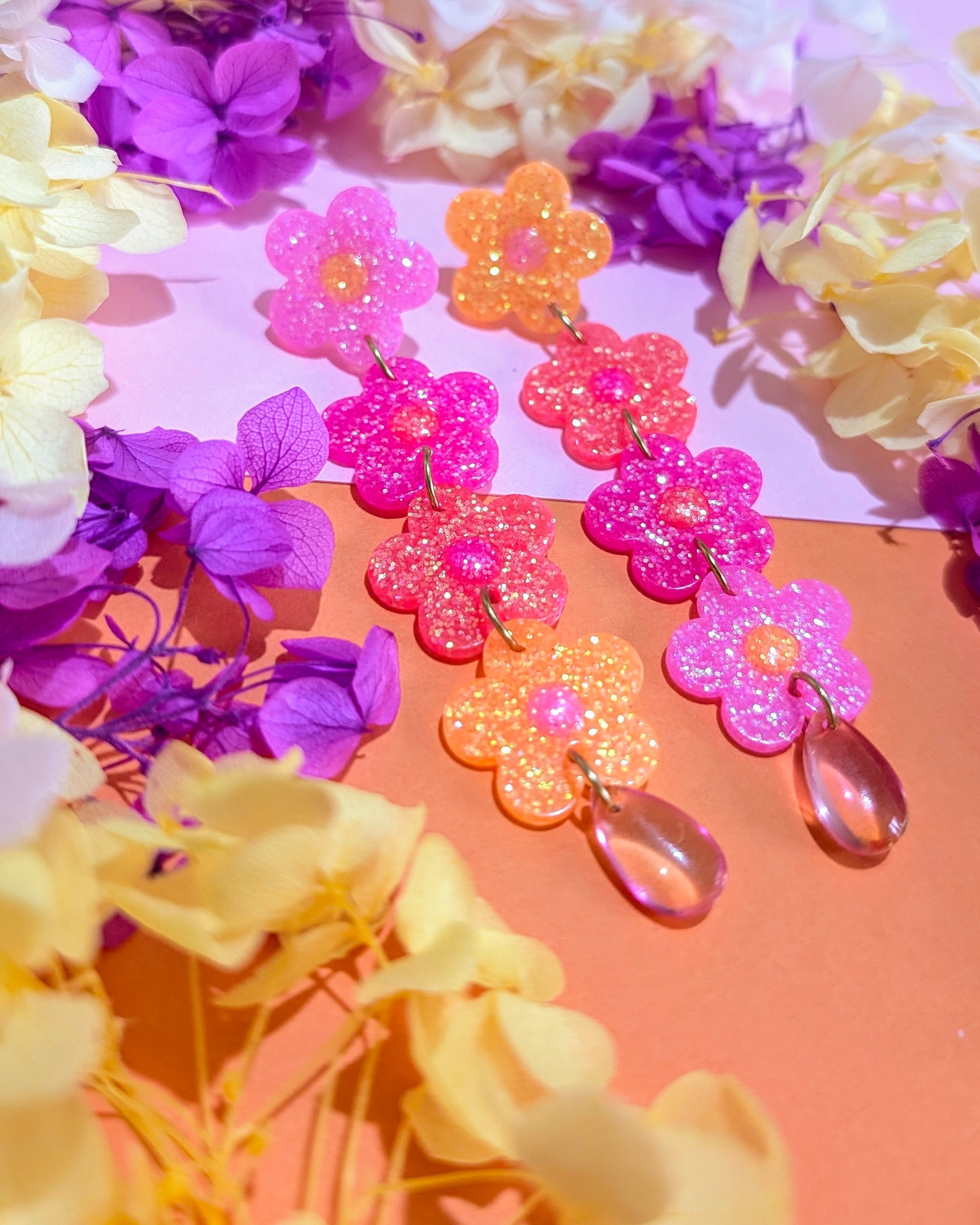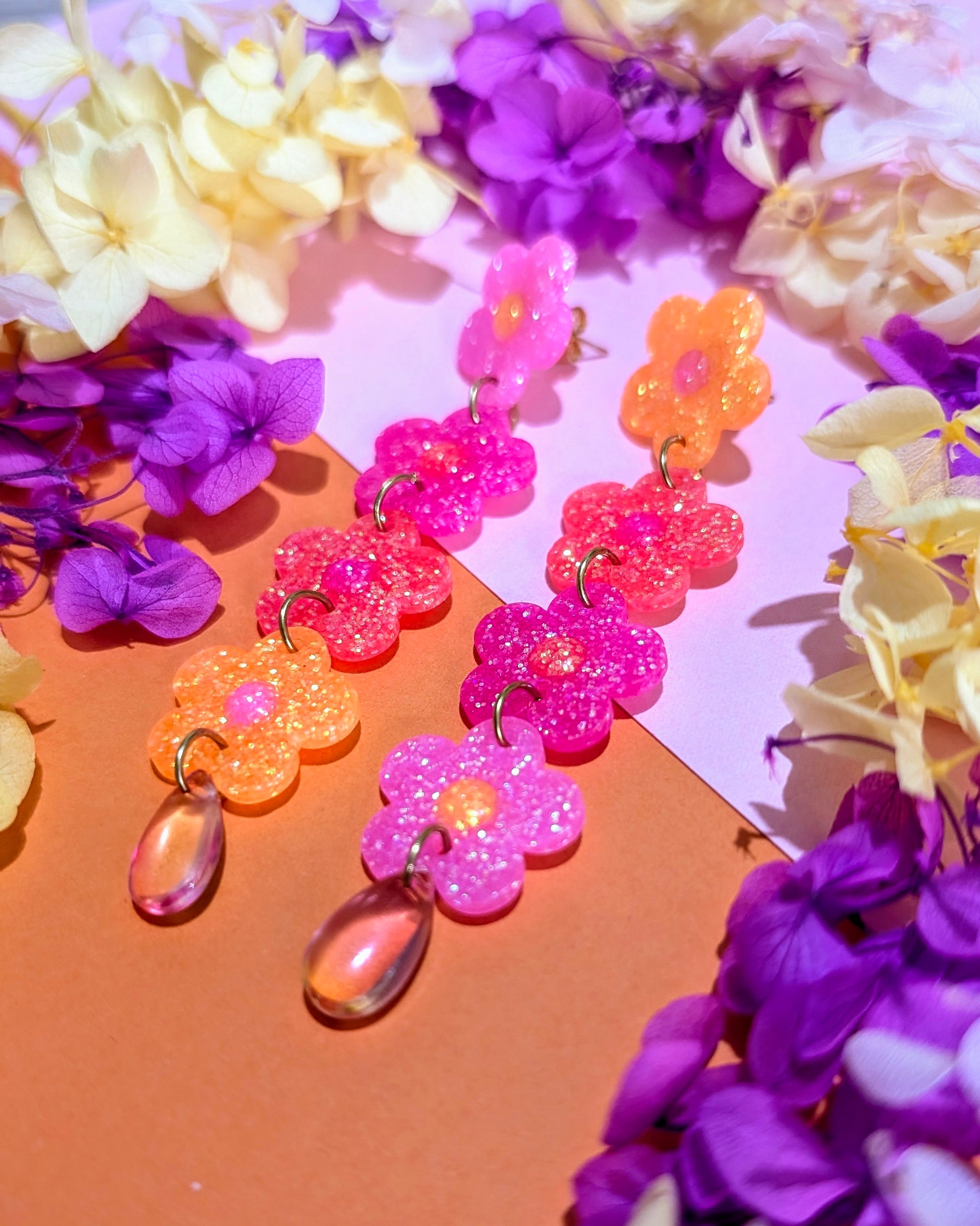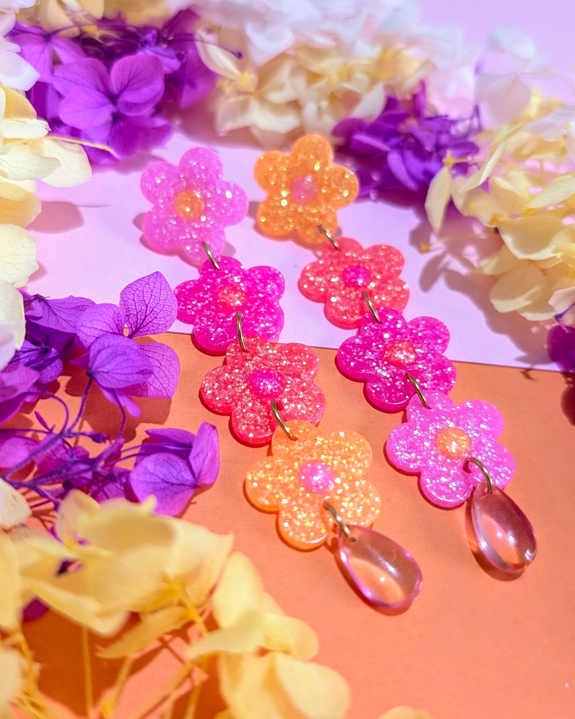 - Boucles uniques faites en résine UV et paillettes